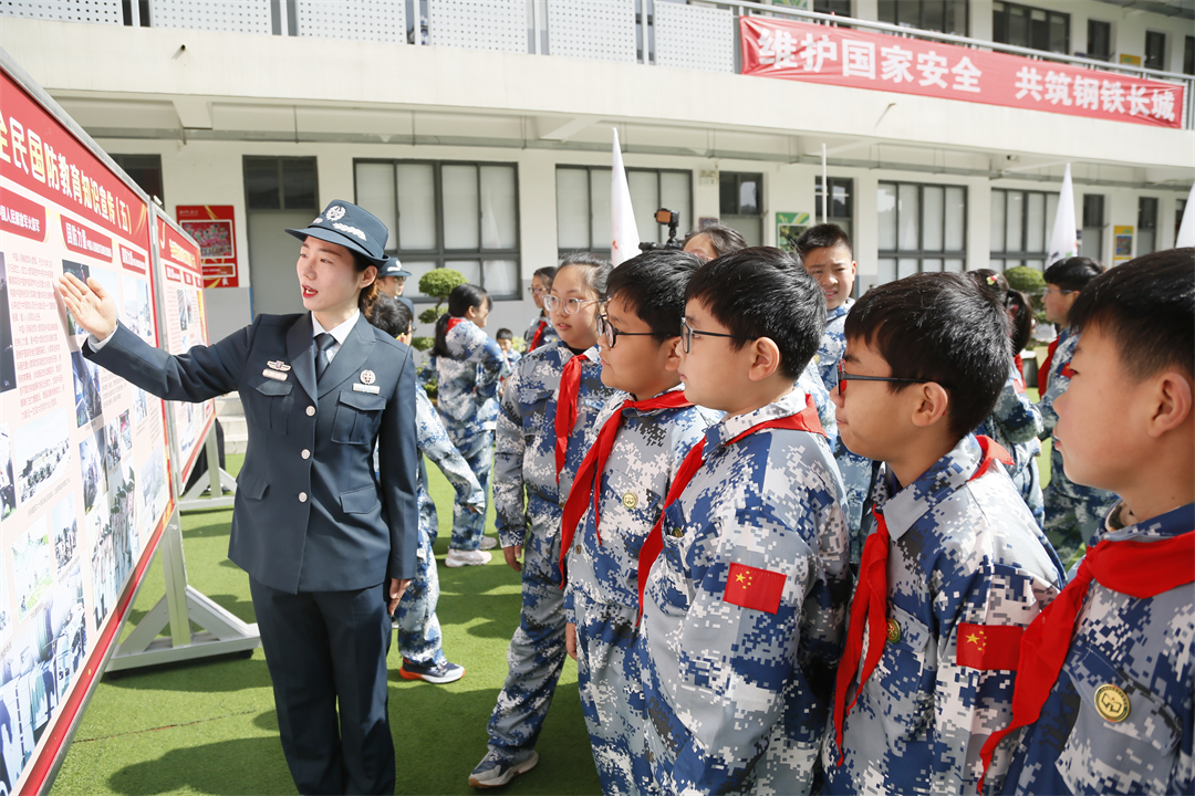 图为2023年4月7日,南京警备区进校园开展国防教育,文职人员给小学生介绍国防知识。张永祥 摄