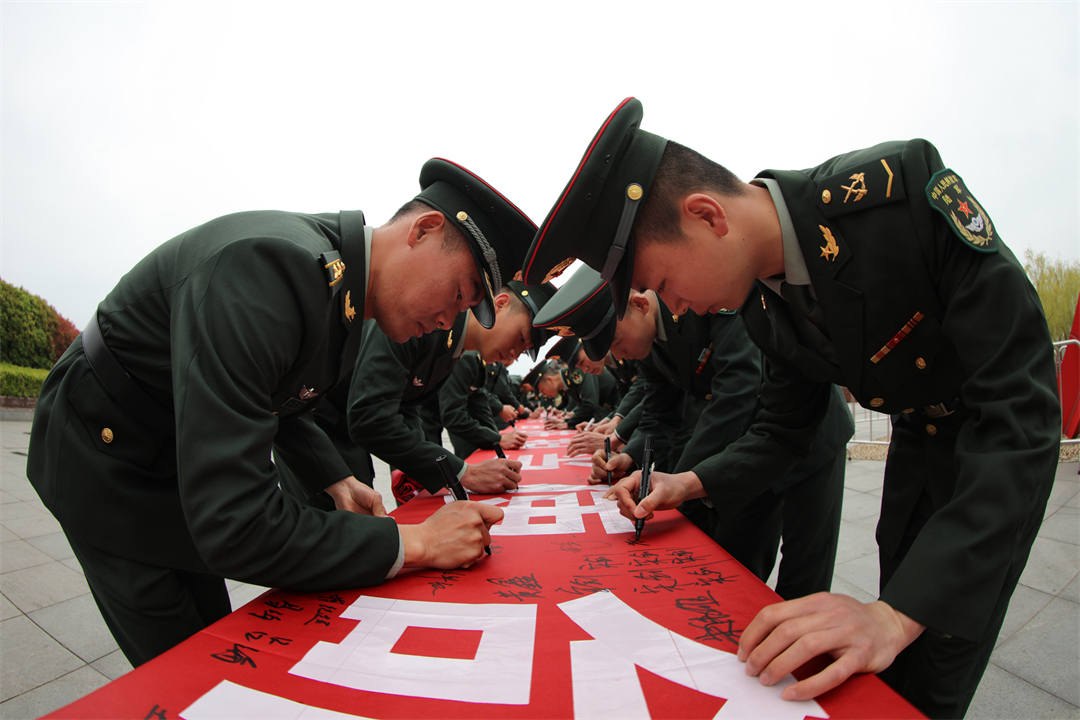 图为3月28日,陆军第71集团军“临汾旅”组织官兵代表在“缅怀革命先烈 奋进担当使命”横幅上签字。万里想 摄