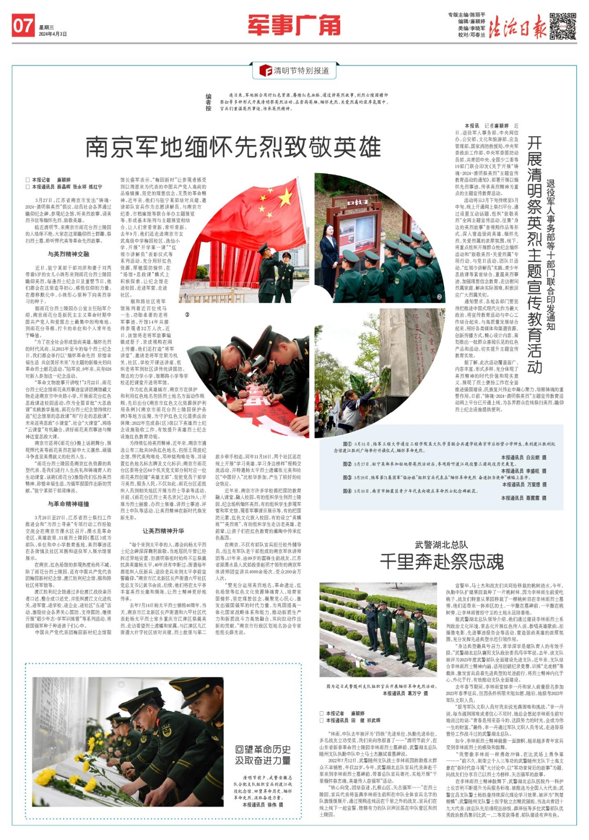 3月27日,江苏省南京市发出“铸魂·2024·清明祭英烈”倡议,动员社会各界通过瞻仰纪念碑、参观纪念馆、听英烈故事、诵英烈书信等缅怀先烈、致敬英雄。