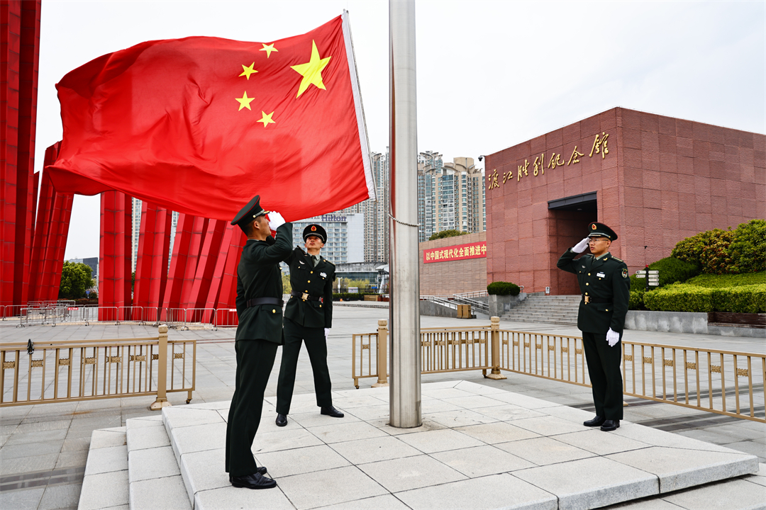 图为3月31日,陆军工程大学通信工程学院某大队学员联合共建学校南京市后标营小学师生,来到渡江胜利纪念馆渡江胜利广场举行升旗仪式,缅怀革命先烈。白云朗 摄