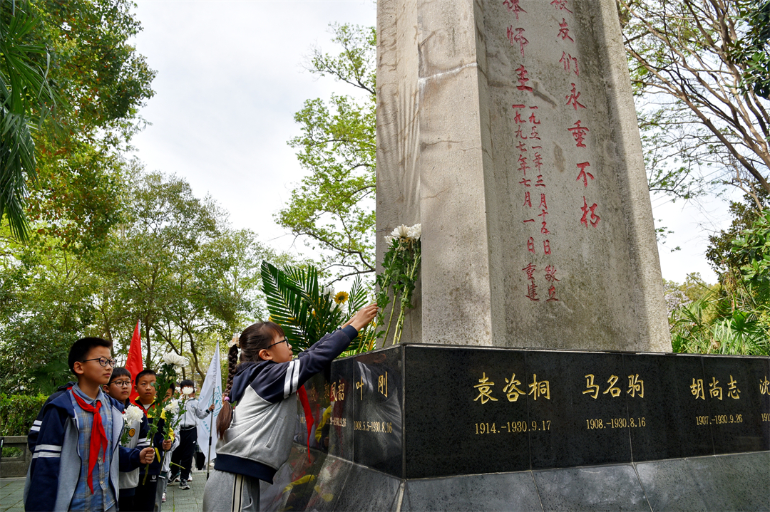 图为3月30日,南京市栖霞区青少年代表向晓庄革命烈士纪念碑献花。聂露露 摄