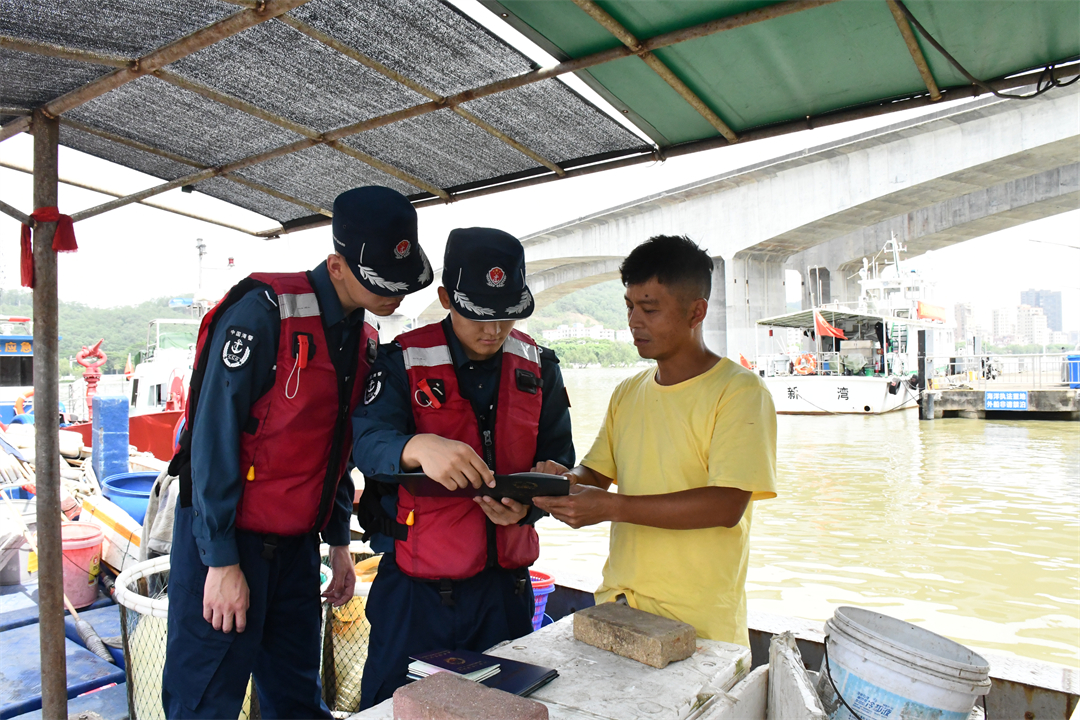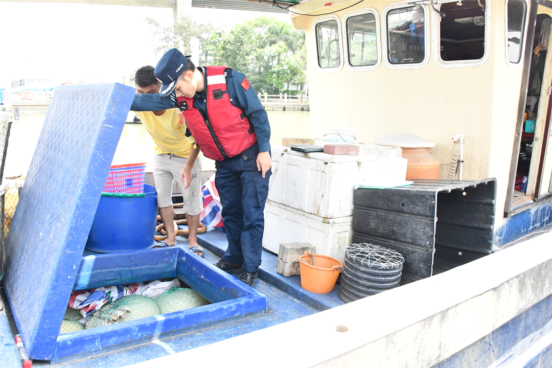 图为海警执法员对辖区沿海码头设施、建筑物和船只进行地毯式排查。