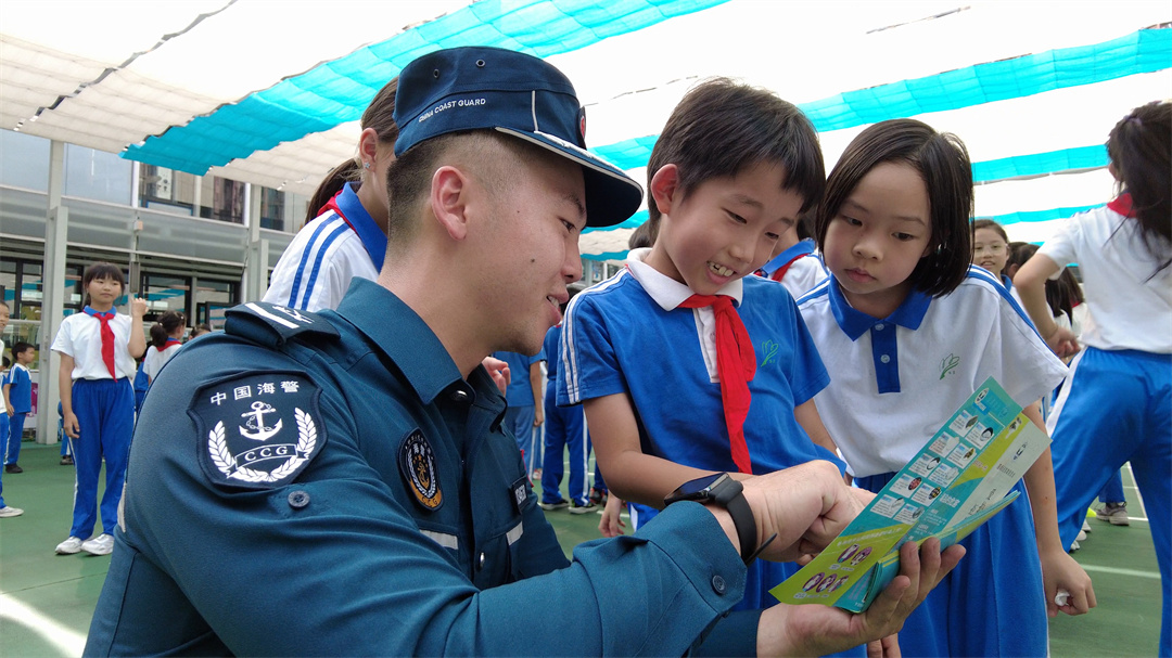 图为海警执法员向同学们发放禁毒预防宣传折页。