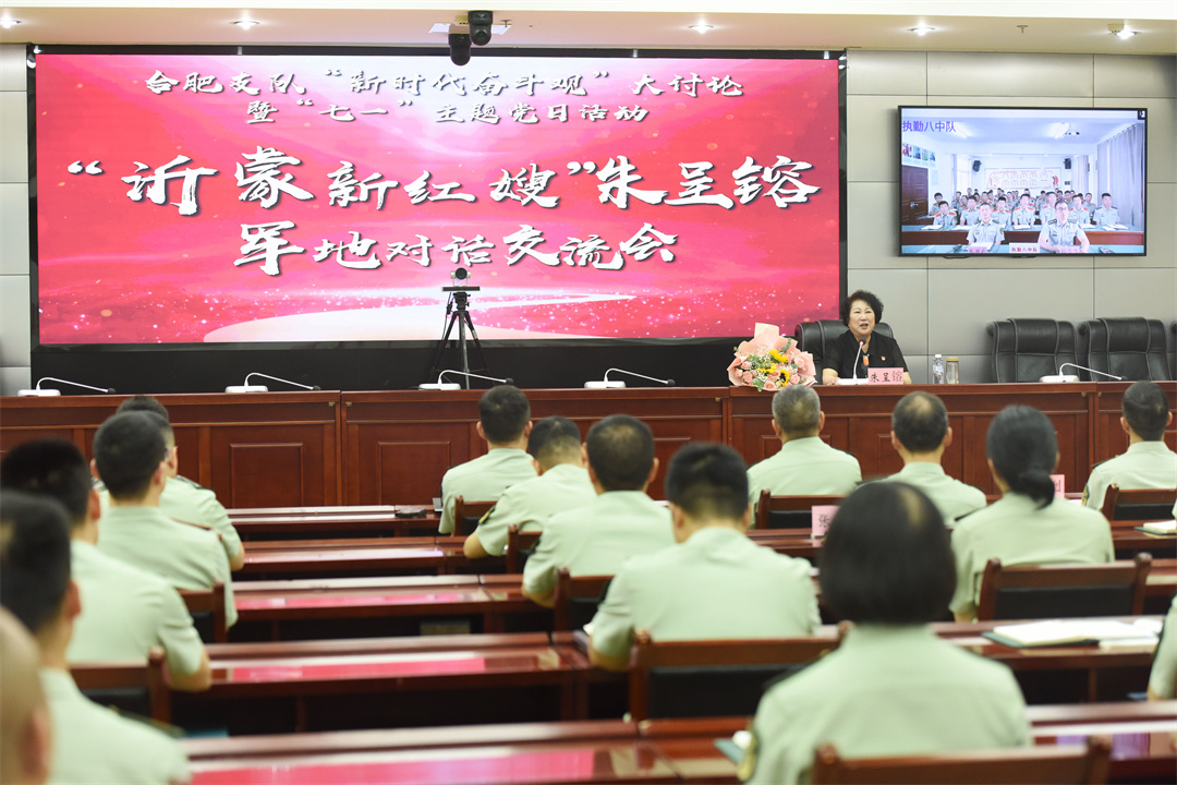 “七一”前夕,武警安徽总队合肥支队开展“新时代奋斗观”大讨论暨“七一”主题党日活动。其间,邀请“全国最美拥军人物”“全国争先创优优秀共产党员”“全国巾帼建功标兵”“沂蒙新红嫂”朱呈镕来到军营,与支队官兵对话交流,分享奋斗故事,传播沂蒙精神。激励广大官兵赓续红色血脉,砥砺初心使命,立足本职岗位奋斗拼搏,书写精彩军旅乐章。