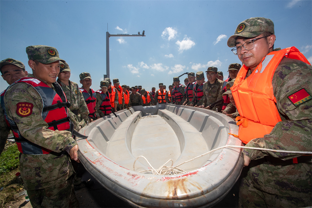 图为湖南省军区民兵携带冲锋舟开展抢险救援工作。张必闻 摄