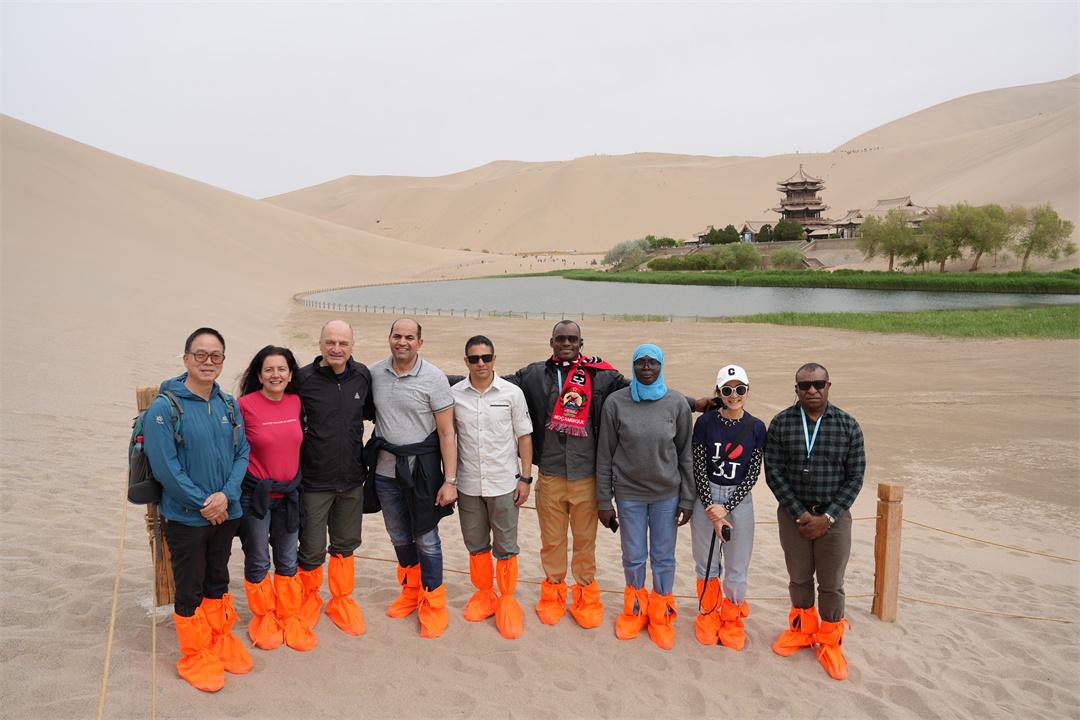 在敦煌,现地教学团一行走进鸣沙山月牙泉景区,领略了“大漠孤烟直,长河落日圆”的自然风光。在享有“东方艺术宝库”美誉的莫高窟壁画和佛像前,外军学员对莫高窟历史文化价值给予高度评价。