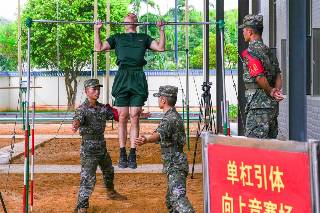 图为参赛官兵正在进行单杠引体向上竞赛。