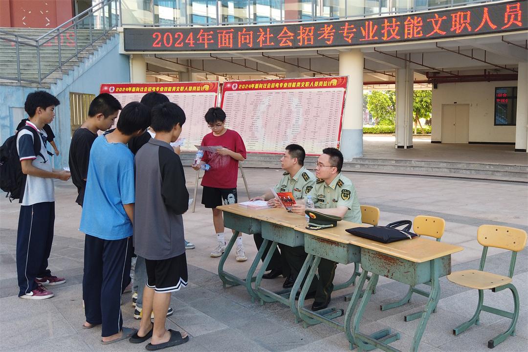 同一时间,武警福建总队文职人员招聘宣讲员来到莆田职业技术学校进行宣讲活动,通过召开政策宣讲会、张贴宣传海报、现场答疑咨询等方式,让在校学生更加详细全面地了解文职人员招考条件和要求,鼓励更多有志青年加入“孔雀蓝”,为军队文职人员方阵注入新鲜血液。