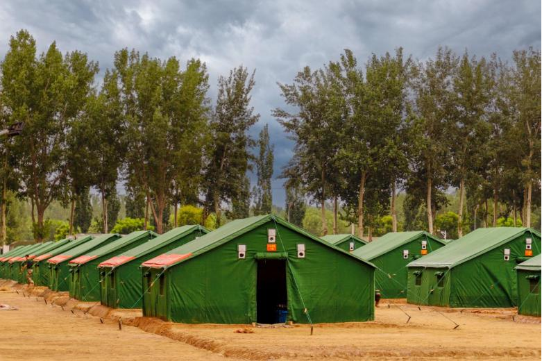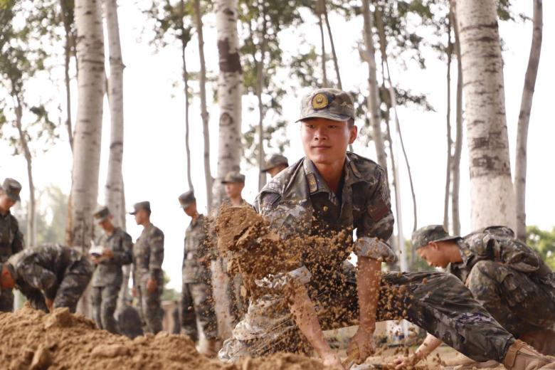 抵达驻训场后,各单位迅速展开物资卸载、土地平整、通水通电、帐篷搭建等工作。