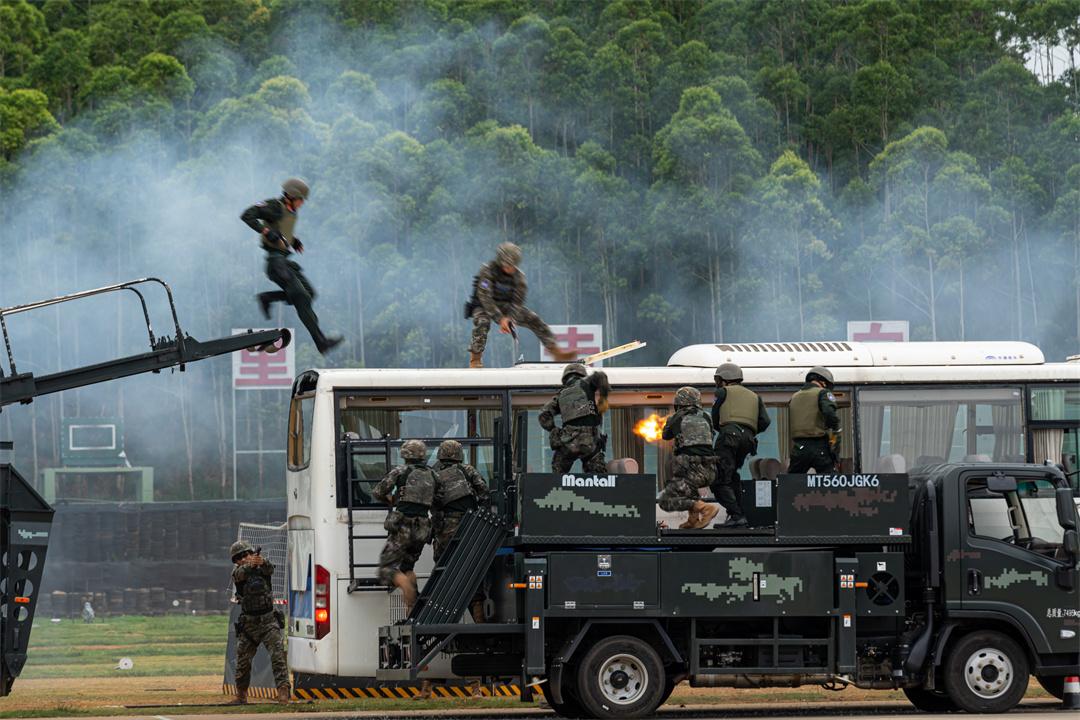 图为7月31日,中越双方组织进行公交车反劫持演练,队员对“暴恐分子”发起突击。陈绿祥 摄