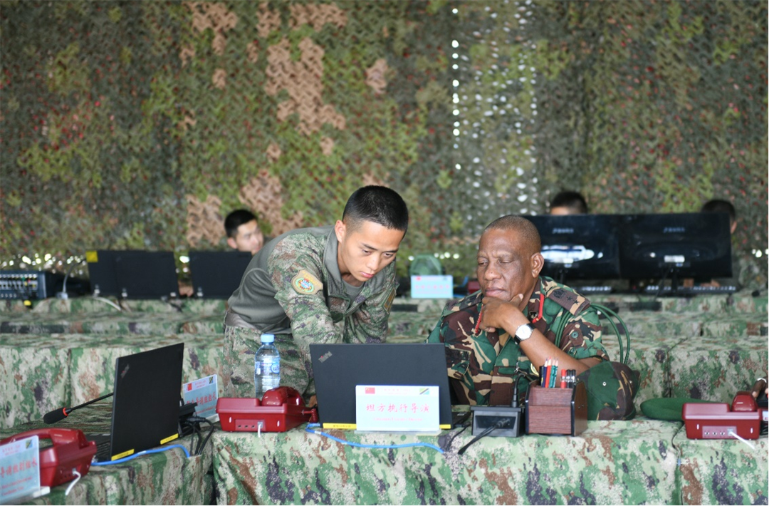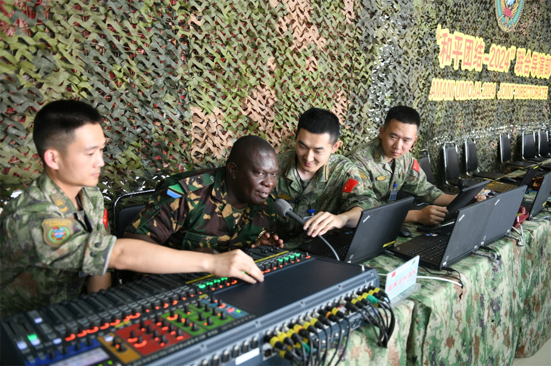 “Can you hear me?”“It sounds good!”近日,在中坦双方后台保障人员精心调试下,“和平团结-2024”联合演习导播控制系统建立完毕,各类信息系统准备就绪。