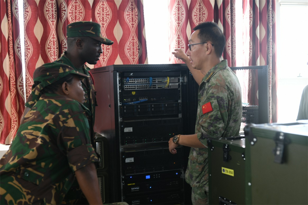 跨境投送前,针对境外陌生地域通信保障特点,围绕现有通信枢纽距离、当前供电负载、接口配件标准等问题,任务部队与坦方预先沟通联系。进驻后,官兵第一时间奔赴各自点位,争分夺秒开设信息系统,与坦方保障人员一起完成场地信息基础设施整治,高效开展联调联试。其间,双方保障人员积极沟通互动,互相学习保障经验,在深化业务交流中进一步加深两军友谊。