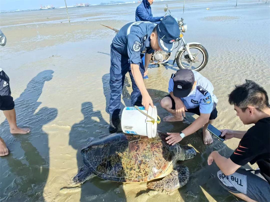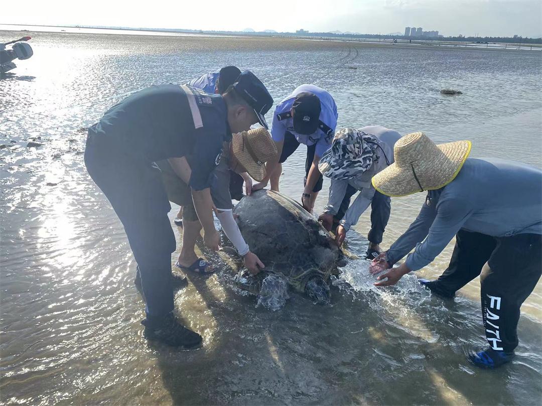 8月6日,广东茂名海警局滨海工作站联合驻地博贺派出所,在博贺港旅游码头附近海域成功救助一只搁浅海龟,并将其放生回归海洋。