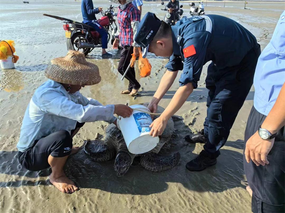 为避免绿海龟遭受二次伤害,执法员一边清理附近沙石杂物,一边采用水桶浇水方式对其进行保湿。观察一段时间后,绿海龟生命体征和行动能力开始逐渐恢复,随即被送至安全开阔海域放生。
