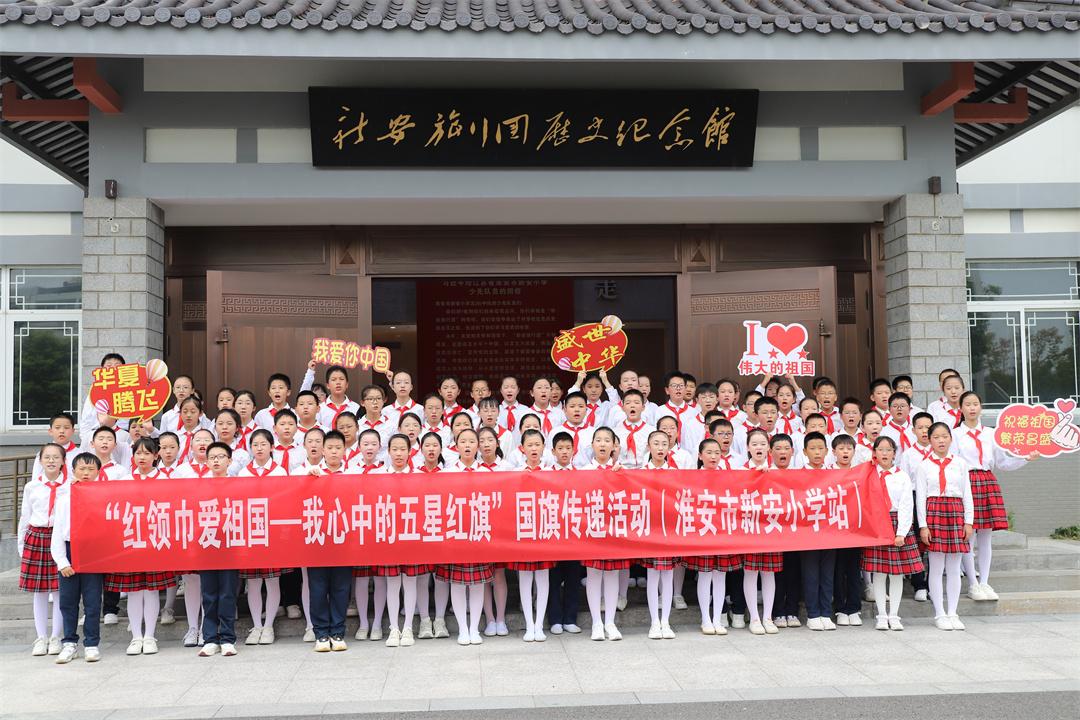 8月21日上午,“红领巾爱祖国——我心中的五星红旗”国旗传递活动来到江苏省淮安市,在淮安市新安小学传递。少先队校外辅导员、消防员代表陈新宽,淮安市、区少先队总辅导员,新安小学少先队大队及中队辅导员代表,以及新老五(8)中队全体队员逾百人共同参与了本次传递活动。