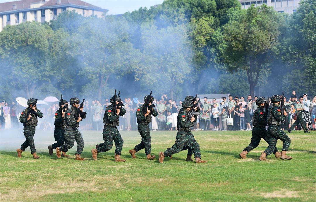 图为官兵在武警合肥支队营区向军嫂军娃演示特种战术战斗动作。