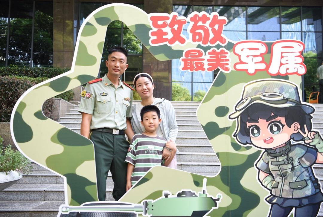 图为在武警合肥支队营区,一级上士刘和勇一家三口打卡拍照留念。