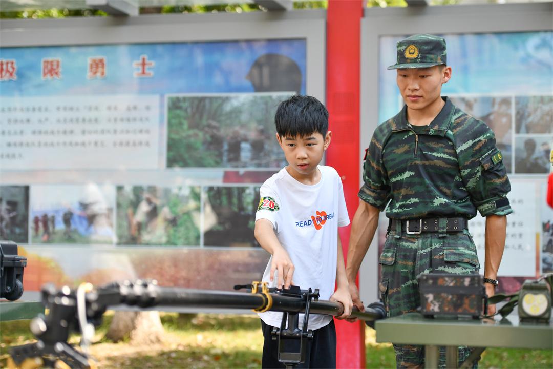 图为军娃在武警合肥支队营区体验武器装备。