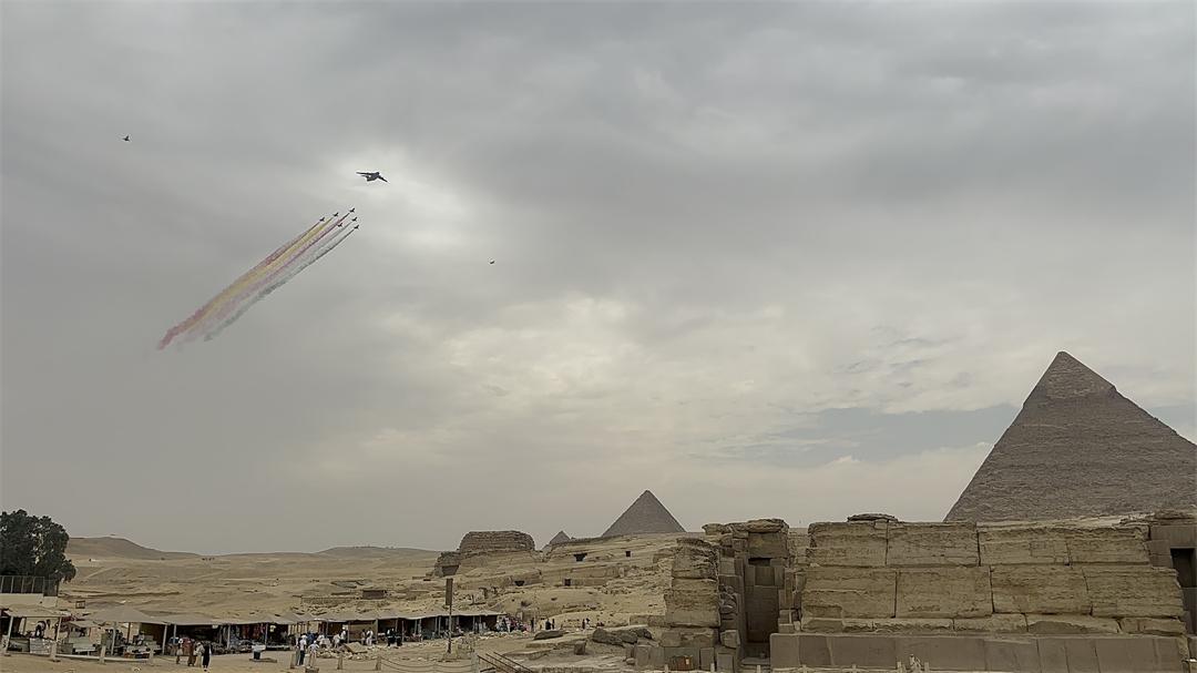 之后,空军八一飞行表演队6架歼-10表演机编组大箭队,拉出彩烟再次飞越金字塔。随后,运-20间隔完成飞越。吉萨金字塔景区内,观众不断挥手致意,争相合影留念。