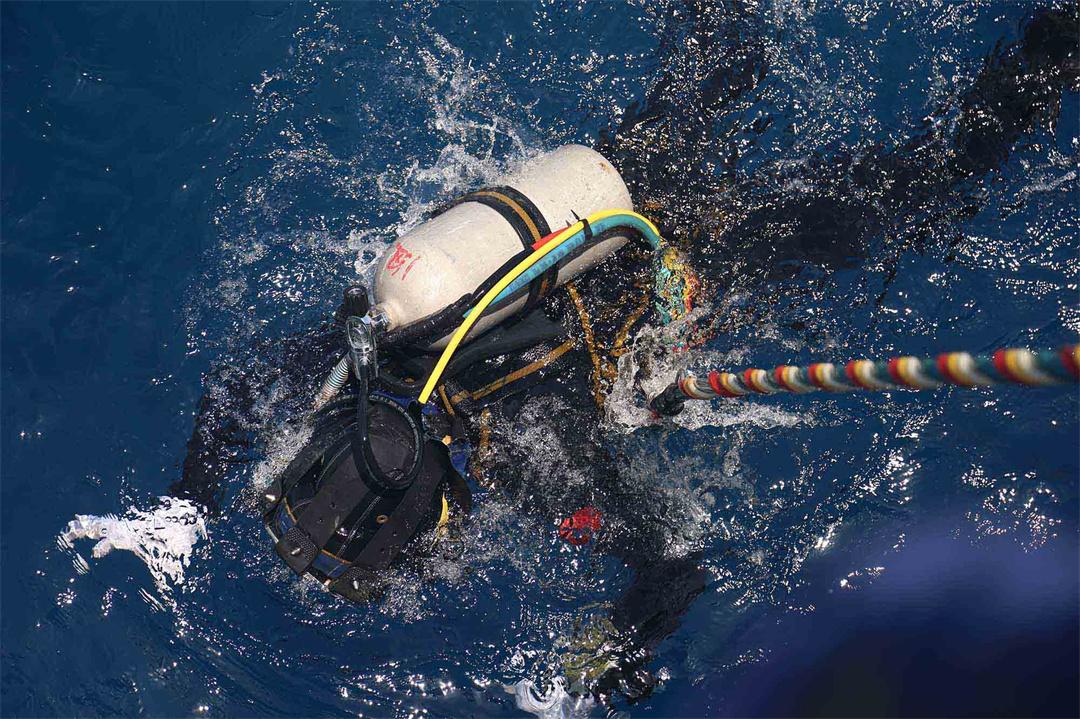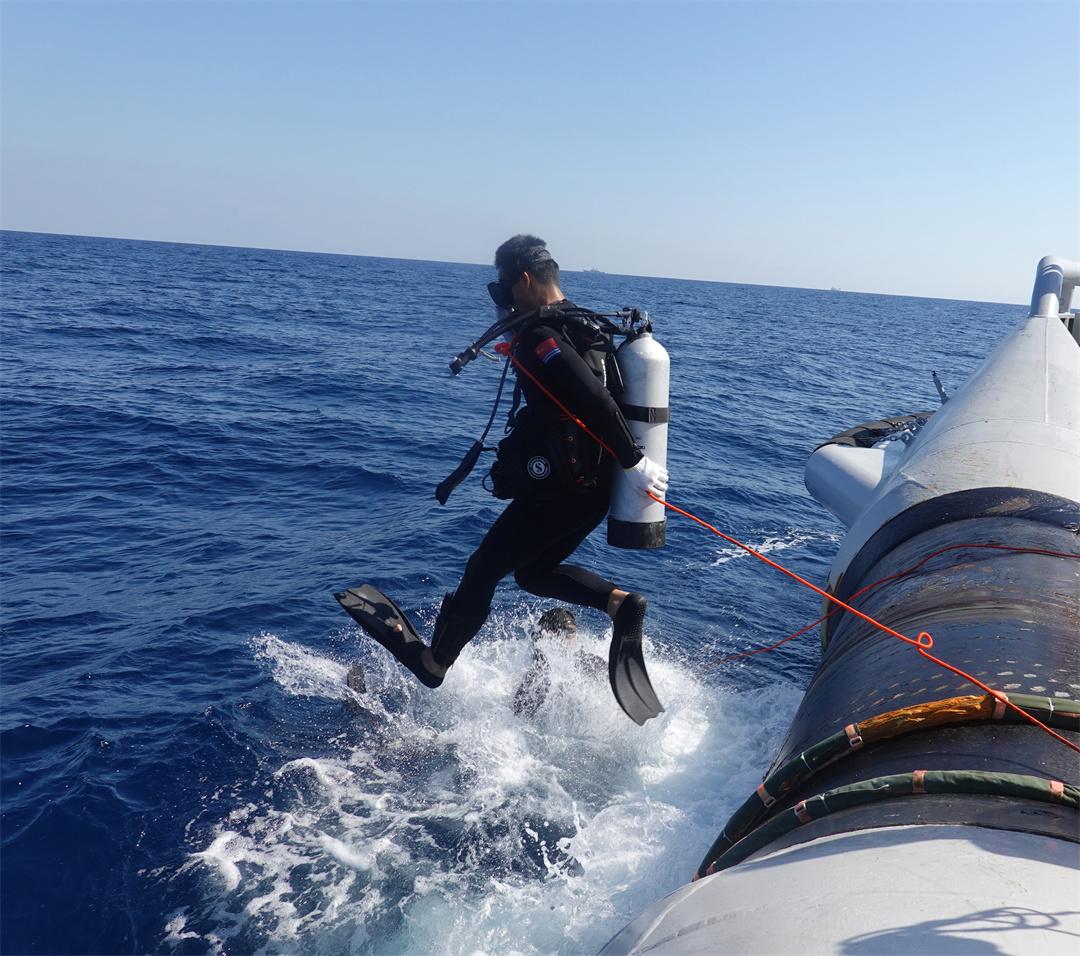 今年4月3日,正在训练的潜水员接到上级命令,立即由训转战,奔赴莺歌海西南海域执行搜索“粤南澳渔36062”轮任务。通过与海军特色医疗中心、南部战区海军第二医院、海南三亚海警局、广州打捞局、海南海事局等军地单位协同合作,该支队圆满完成水面联合搜索、遇难人员遗体打捞、碰撞事故水下取证等任务,在实战中检验了支队核心救援能力。此次救援行动,是该支队饱和潜水首次任务检验。