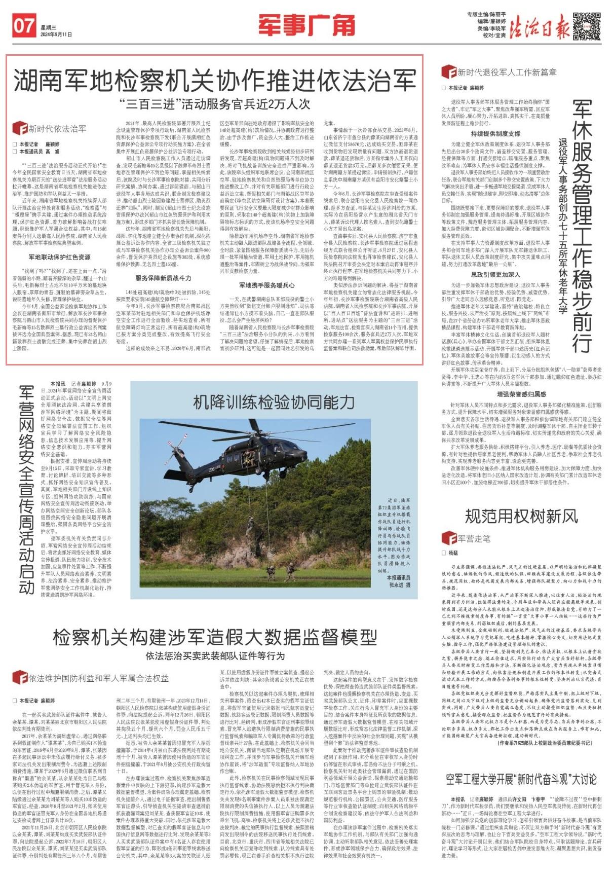 除推动军用机场净空外,湖南省军地检察机关主动融入跟进部队战建备全流程、全领域、全时段,紧紧围绕服务保障新质战斗力,先后办理一批军用输油管道、军用土地保护、军用拖机道整治等案件,牢固树立为战保战导向,为强军兴军贡献检察力量。