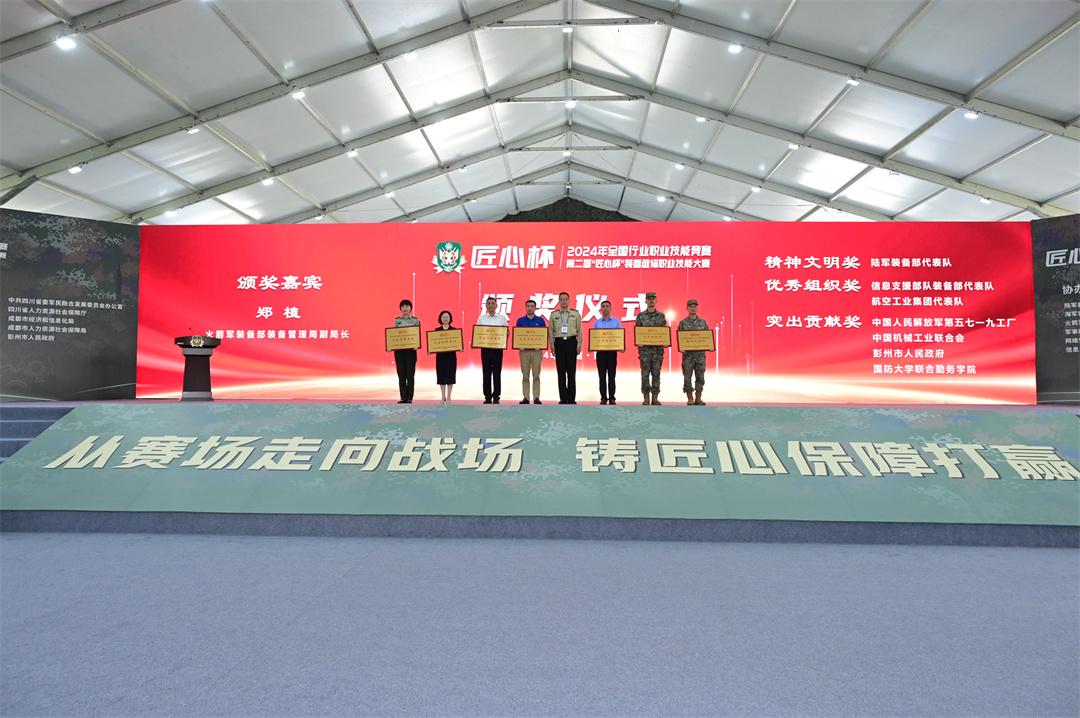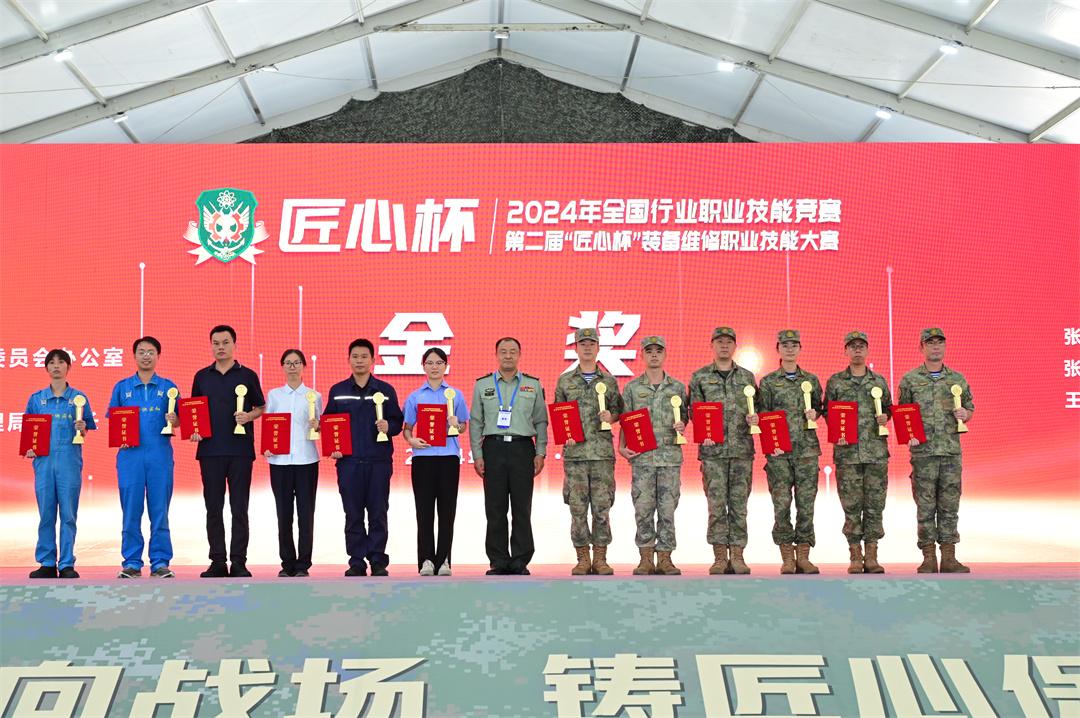 在装配钳工、无损检测、电子专用设备装调、增材制造、工业机器人系统操作、无人机装调检修等项目角逐中,来自陆军、海军、火箭军、信息支援部队的6名官兵夺得军人组竞赛金奖,来自海军修理工厂、空军修理工厂、中国航空工业集团有限公司的6名选手夺得职工组竞赛金奖。海军装备部获得团体一等奖,空军装备部、火箭军装备部获得团体二等奖,中国航空发动机集团有限公司、中国航天科工集团有限公司、中国航天科技集团有限公司获得团体三等奖。