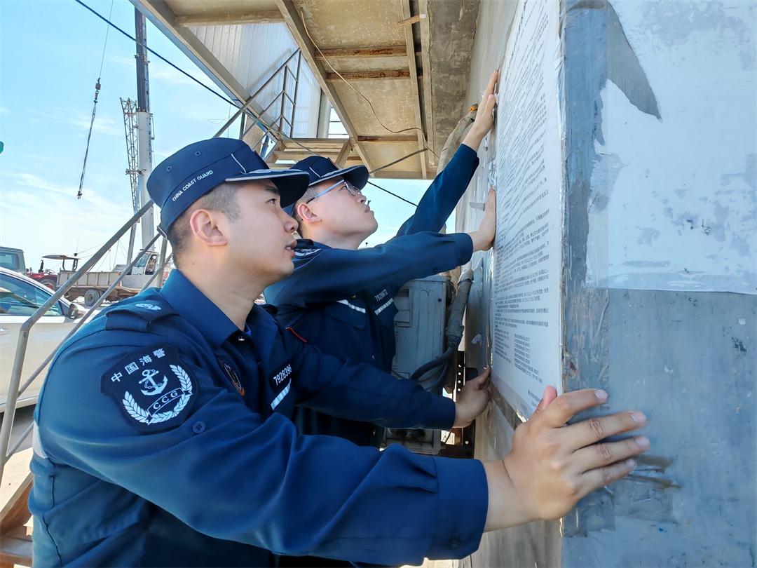 图为山东烟台海警局长岛工作站执法员在辖区北长山岛北城码头张贴执法公告。卢煜萱 摄