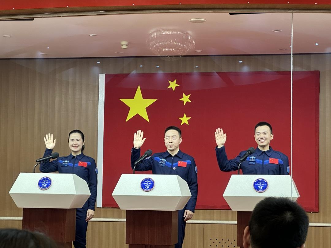 10时,蔡旭哲、宋令东、王浩泽3名乘组航天员在酒泉卫星发射中心问天阁与中外媒体记者集体见面。