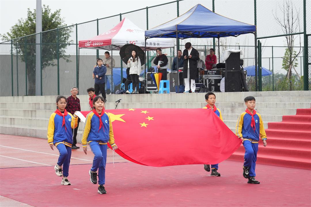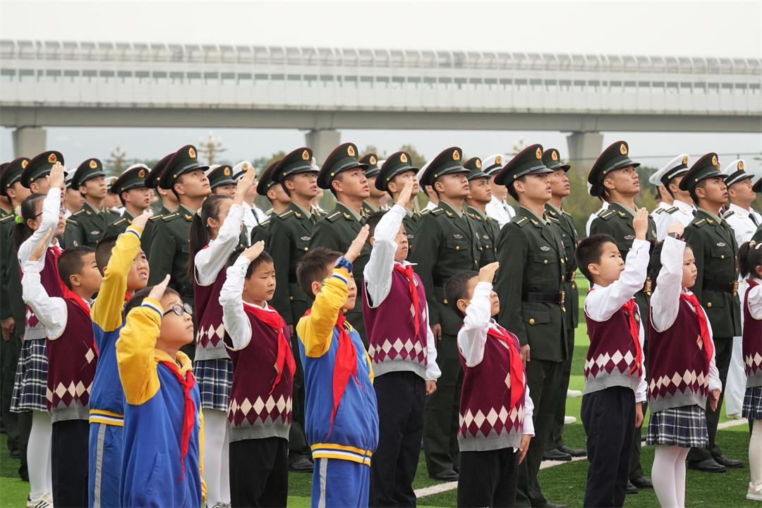 升旗仪式开始前,五星红旗由少先队员代表组成的“红领巾护旗手”方队传递至由航天科技集团七院重庆航天职业技术学院共青团员军士生组成的国旗护卫队。伴随着雄壮激昂的国歌,鲜艳的五星红旗冉冉升起。