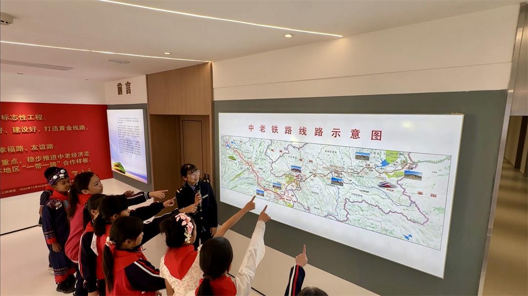 国旗传递仪式结束后,少先队员们与普洱车务段磨憨站工作人员在磨憨铁路口岸智慧展示中心开展“红领巾爱祖国”交流活动。中心有关负责同志为少先队员们讲述了中老铁路建设发展历程。