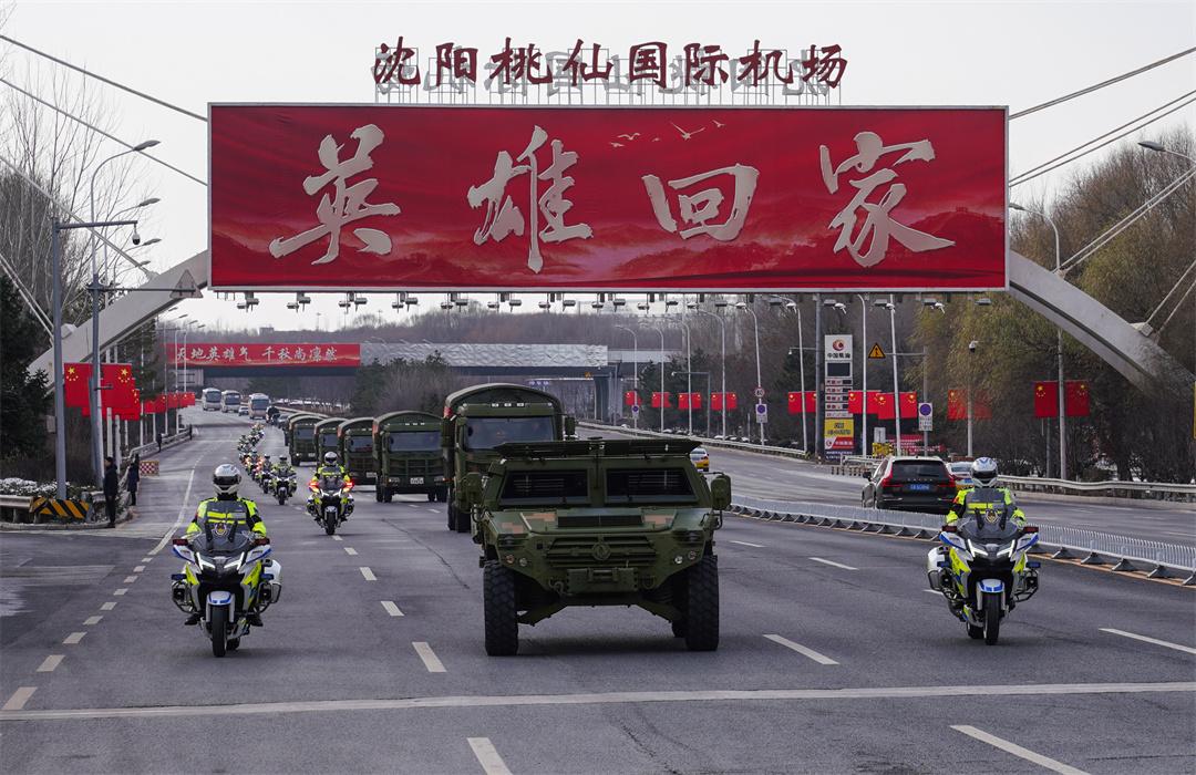 12时07分,空军专机运-20缓缓降落在辽宁沈阳桃仙国际机场。专机进入中国领空后,空军两架歼-20战斗机护航,并在沈阳机场上空通场,“双20”同框向志愿军烈士致以崇高敬意,沈阳桃仙机场以“过水门”航空最高礼仪迎接志愿军烈士遗骸回家。