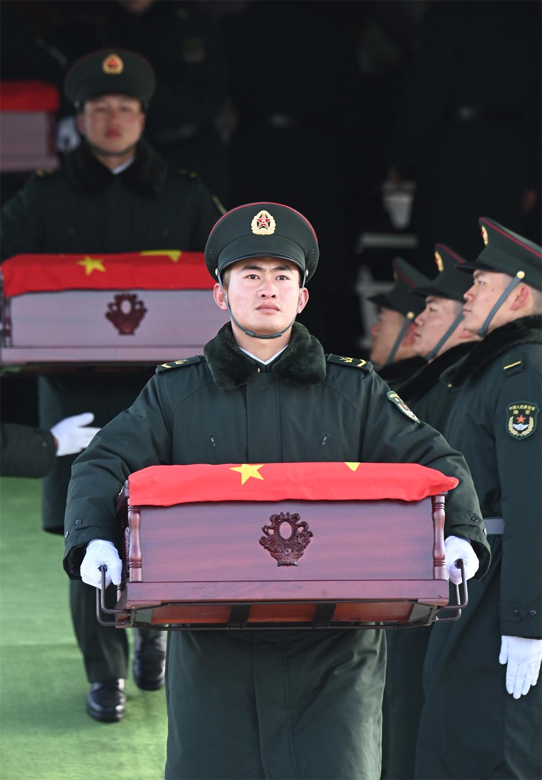 仪式现场庄严肃穆,志愿军烈士遗骸的棺椁覆盖着五星红旗,到场迎接的解放军官兵军容威严、持枪鹄立,现场全体人员向烈士遗骸行三鞠躬礼,以此表达对先烈们的深切缅怀和无限哀思。