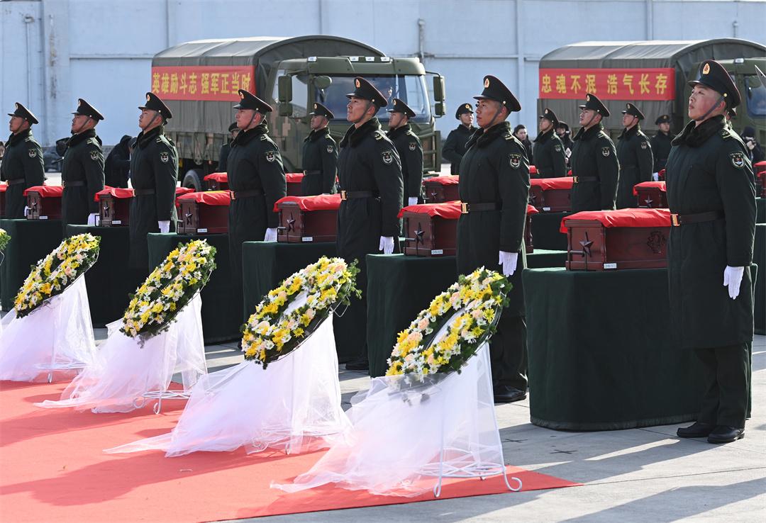 军号手吹响婉转低回的《思念曲》,仪式现场庄严肃穆。在悠长的音乐声中,43位志愿军烈士遗骸的棺椁覆盖着五星红旗,由礼兵缓步护送至棺椁摆放区。