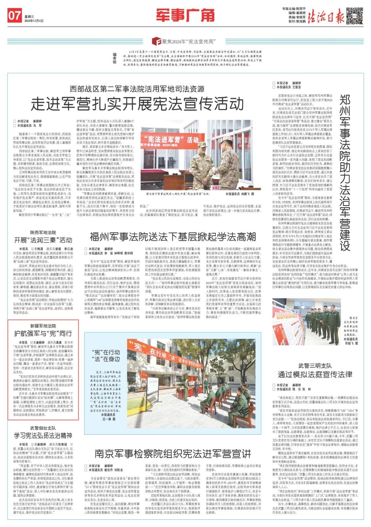 “官兵们在形式多样的活动中提升法律认识、廓清涉法疑问、强固法治观念。我们要加强同军事法院沟通协作,借助专业力量深入推进依法治军战略贯彻落实。”空军某部政治委员说。