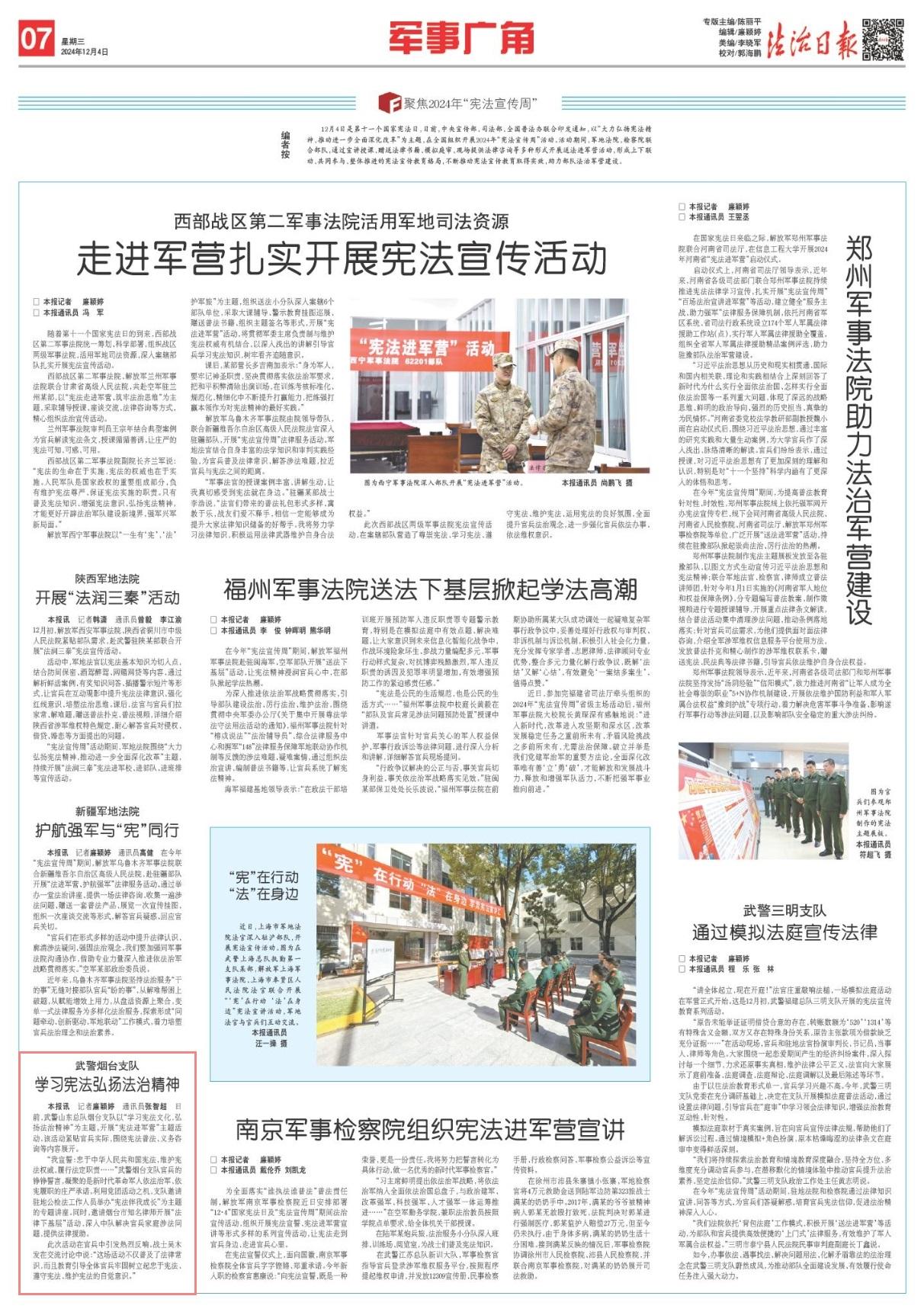 日前,武警山东总队烟台支队以“学习宪法文化,弘扬法治精神”为主题,开展“宪法进军营”主题活动。该活动紧贴官兵实际,围绕宪法普法、义务咨询等内容展开。