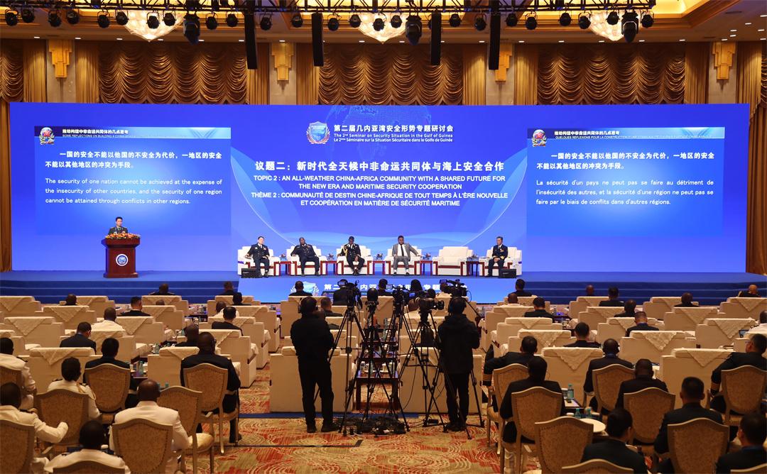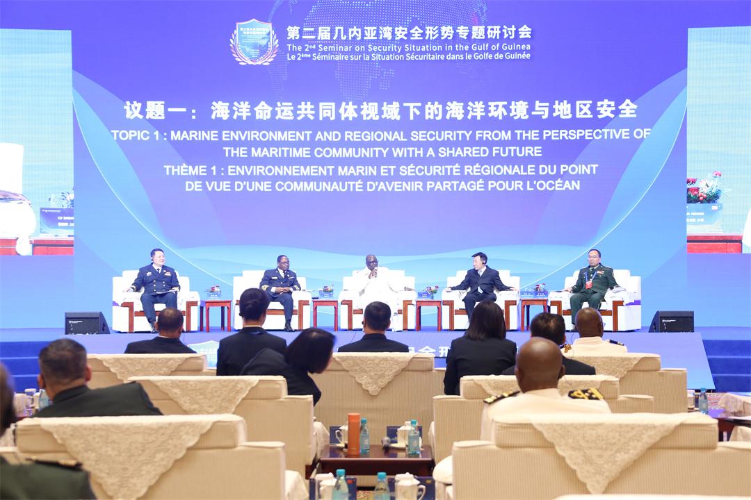 研讨会期间,中国海军司令员胡中明上将作主旨发言,贝宁、佛得角、喀麦隆、刚果(布)、刚果(金)、加蓬、冈比亚、几内亚、尼日利亚等9个国家代表团团长围绕“几内亚湾海上安全形势与合作”主题进行发言,部分外方代表和中方专家学者参与“海洋命运共同体视域下的海洋环境与地区安全”“新时代全天候中非命运共同体与海上安全合作”2个分议题讨论交流,就更好落实中非合作论坛北京峰会成果、推动实施“安全共筑伙伴行动”发表观点和见解。现场互动环节,与会人员针对大家关心的安全合作问题踊跃提问,深入探讨共同应对海盗、走私、非法捕捞等海上威胁和挑战的有效举措,现场气氛友好热烈。