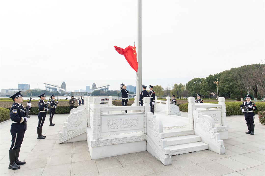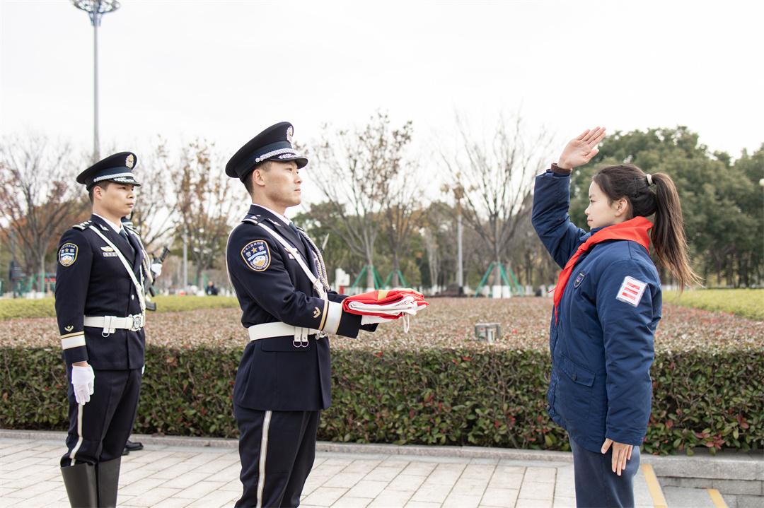 活动现场,少先队员整齐列队。骆叶青将这面曾遨游太空、满载祖国荣誉的五星红旗递交给王麓涵,随后国旗传递至全国优秀少先队集体秀城实验教育集团少先队大队长陆昕林,交由公安民警后,举行隆重的升旗仪式。