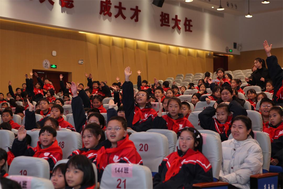 在国旗下,少先队员代表深情讲述了自己对祖国的热爱和对航天梦想的追求,坚定表达了为强国建设贡献力量的信念和决心,展现了新时代少年儿童积极向上、朝气蓬勃的精神风貌。随后,现场全体少先队员庄严宣誓,响彻云霄的誓言印证了他们热爱党、热爱祖国、热爱人民的信念。