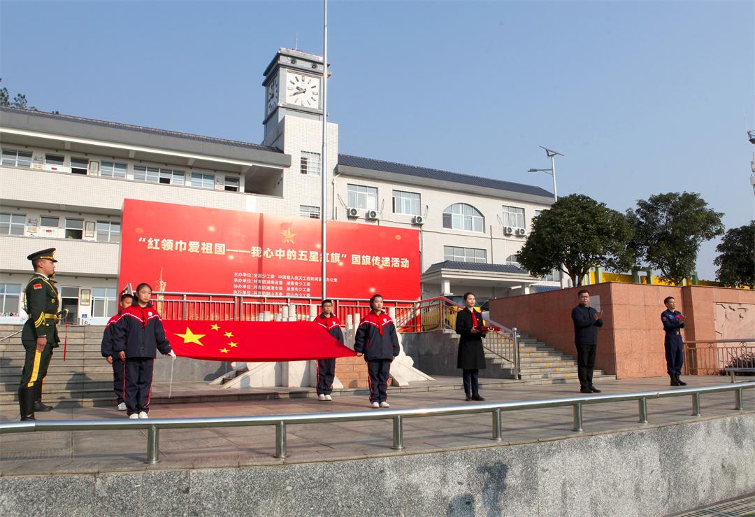 国旗传递交接仪式上,英雄航天员汤洪波手捧这面遨游太空、满载祖国荣誉的五星红旗,将其依次传递给湖南省少工委负责同志、优秀少先队辅导员代表、少先队员代表。