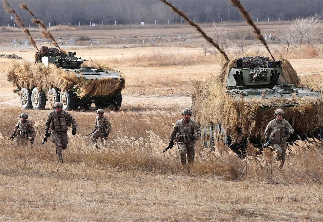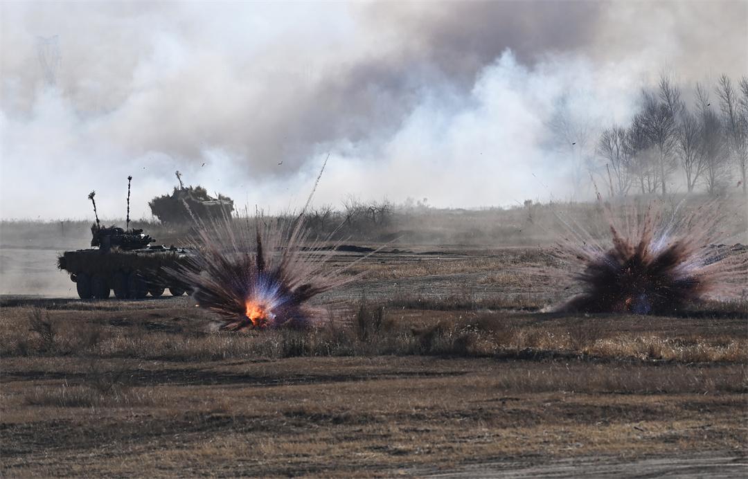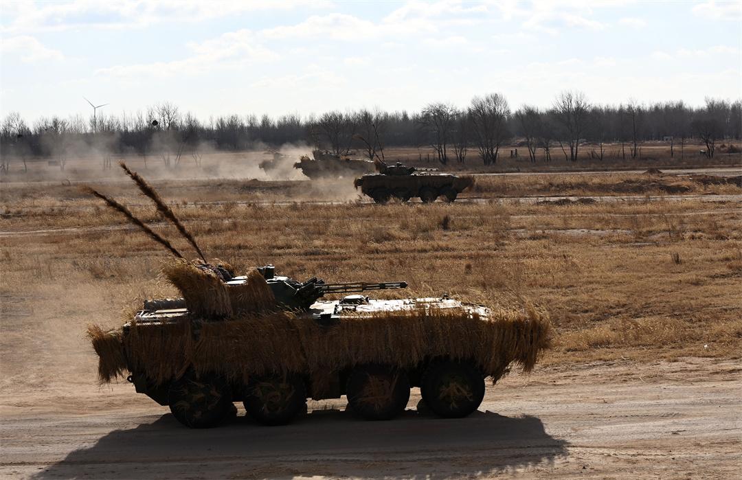 图为“百战百胜营”官兵驾驶步战车进行实弹战术综合演练。