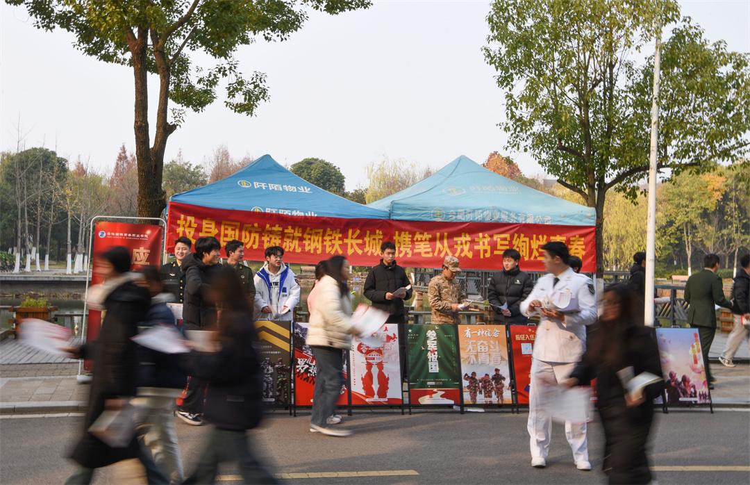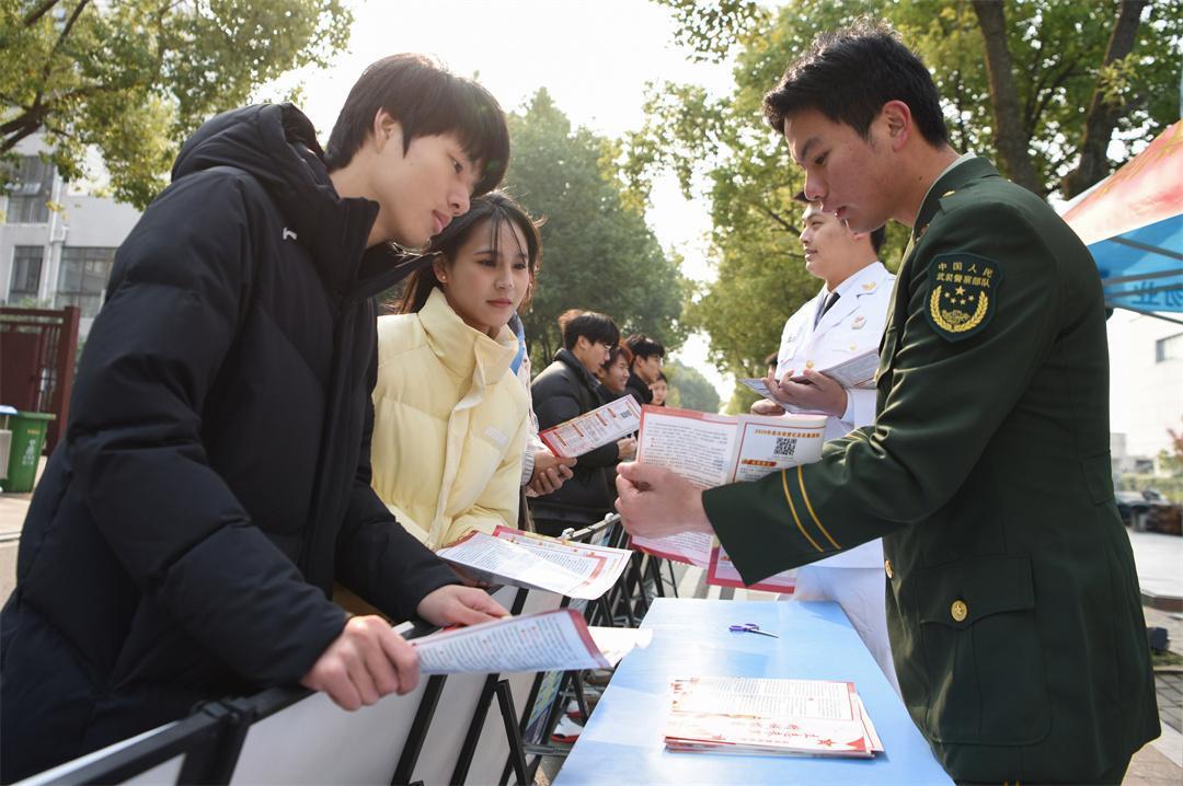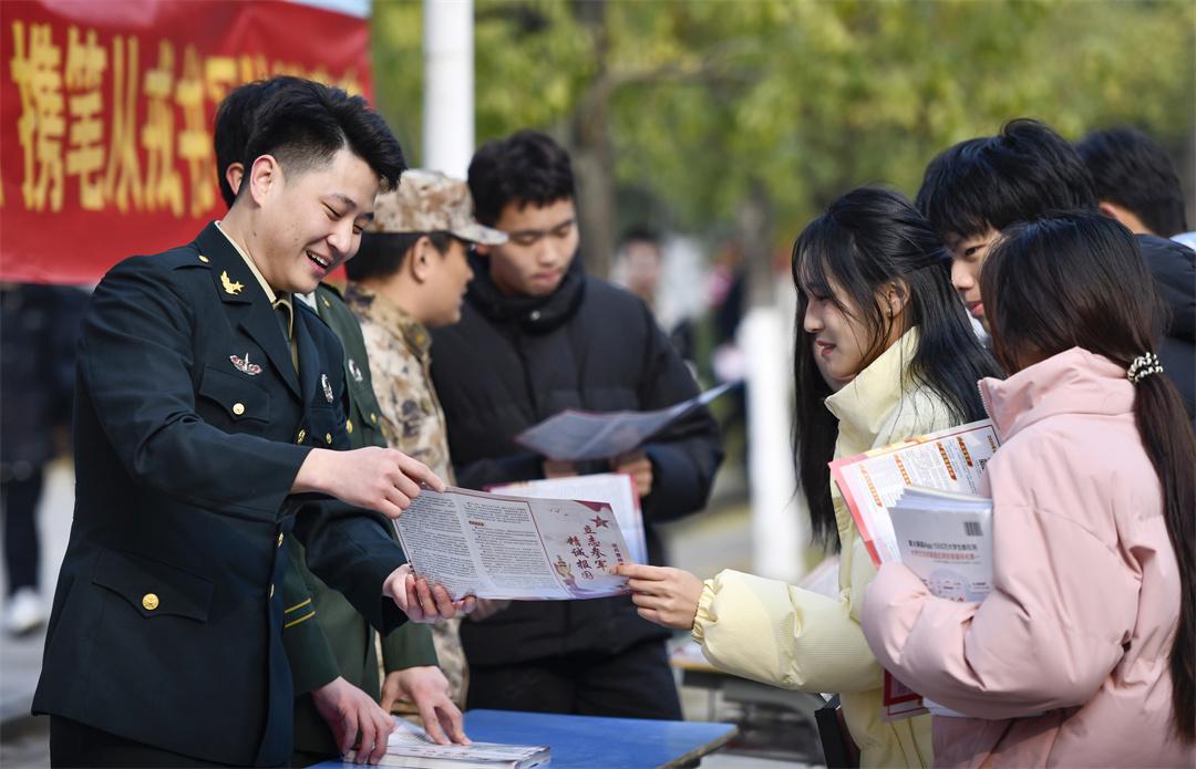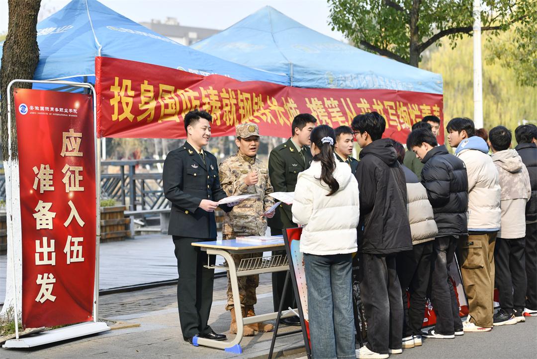 连日来,安徽省合肥市长丰县人武部组织退役大学生士兵“征兵宣传小分队”,深入辖区各学校开展“征兵宣传进校园”活动,动员广大有志青年踊跃报名参军,不断激发青年学子献身国防的热情。图为在合肥市双凤经济开发区安徽商务职业学院,征兵宣传工作人员向学生宣讲征兵政策。
