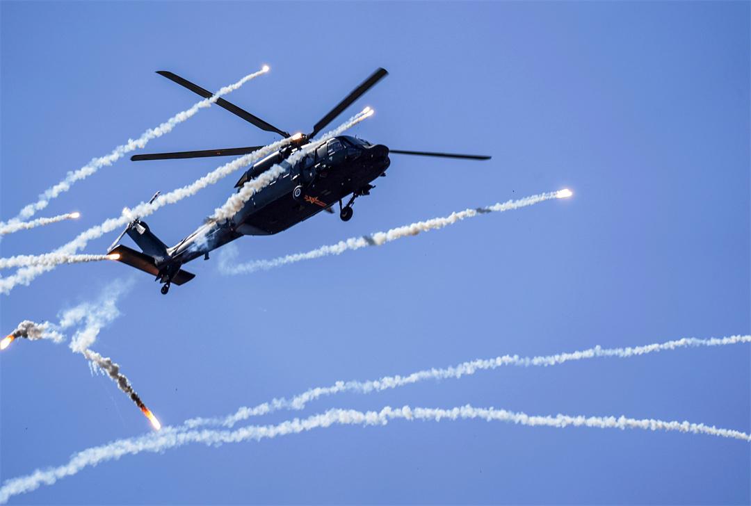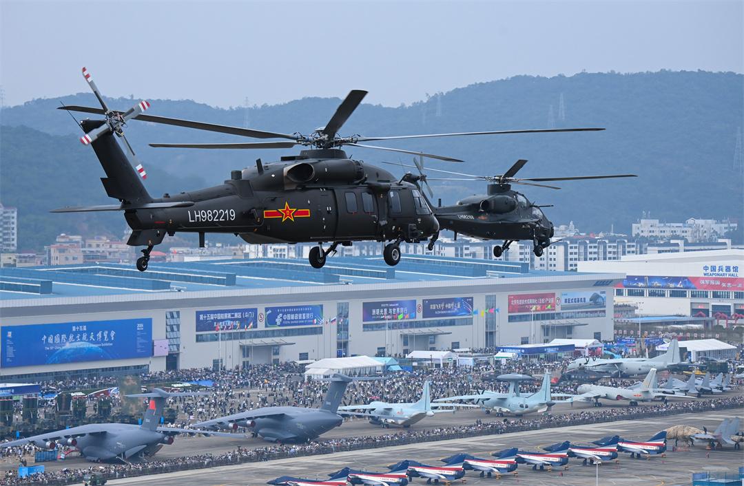 蓝天之下,战机轰鸣。第十五届中国航展现场,陆军数架多型战机贯空而来,呈战斗队形通场。