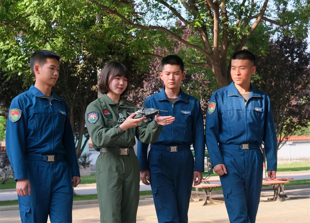 图为女飞行教员刘玥玮(左二)为男飞行学员讲授飞行战术动作。