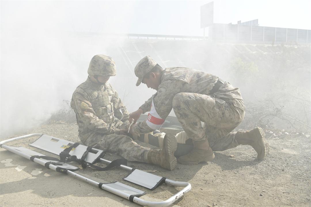 战场情况瞬息变化,情况一个接着一个。“报告指挥员,我分队遭敌袭击,有2人受伤严重,无法继续参加‘战斗’。”“迅速组织伤员救护转移。”由地方医疗专业力量组成的医疗救护分队迅速反应,穿过浓烟赶赴“战场”,现场对“伤员”进行止血、包扎处理后,用担架转移至救护车内组织后送。