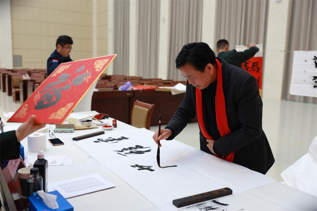 活动现场,书画家们挥毫泼墨,将新春祝福和美好祝愿凝聚笔端,送到军嫂军娃和官兵代表手中,翰墨飘香中交织着欢声笑语。压纸、蘸墨、起笔、收笔,一起一落间,一张张苍劲有力、笔走龙蛇的“福”字跃然纸上,一幅幅浓墨重彩、寓意吉祥的“花开富贵”图栩栩如生。礼堂里人头攒动,大家簇拥在书法艺术家们身边,看着他们的作品啧啧称赞。