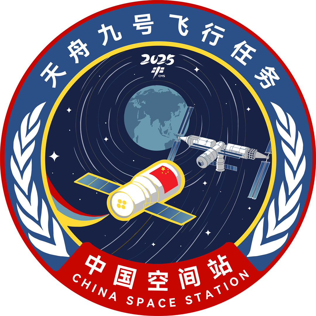 天舟九号飞行任务标识,以地球为背景,飞船与空间站交会对接为视觉中心,展现二者环绕飞行的壮丽姿态。飞船的动感弧线代表飞行轨迹,传递精准和力量的美感。星轨巧绘数字“9”,九颗星辰环绕其间,寓意天舟九号迈向未来,承载着探索太空的远大理想与团队协作精神。标识外圈红色炽热,象征国家荣誉与使命;金色点缀其间,辉映辉煌成就。内圈深蓝如宇宙,广袤无垠,衬托出白色空间站与飞船。