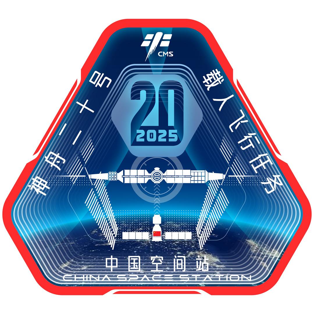 神舟二十号载人飞行任务标识,以稳定三角形为基,象征航天人在经验基础上攀登新高峰。外框红色传承载人飞行使命,内部深蓝寓意浩瀚太空。主体神舟飞船径向对接空间站,太阳翼巧构中文“廿”字(即“二十”)。空间站亮光划破天际,彰显航天人向光前行、勇往直前的精神。