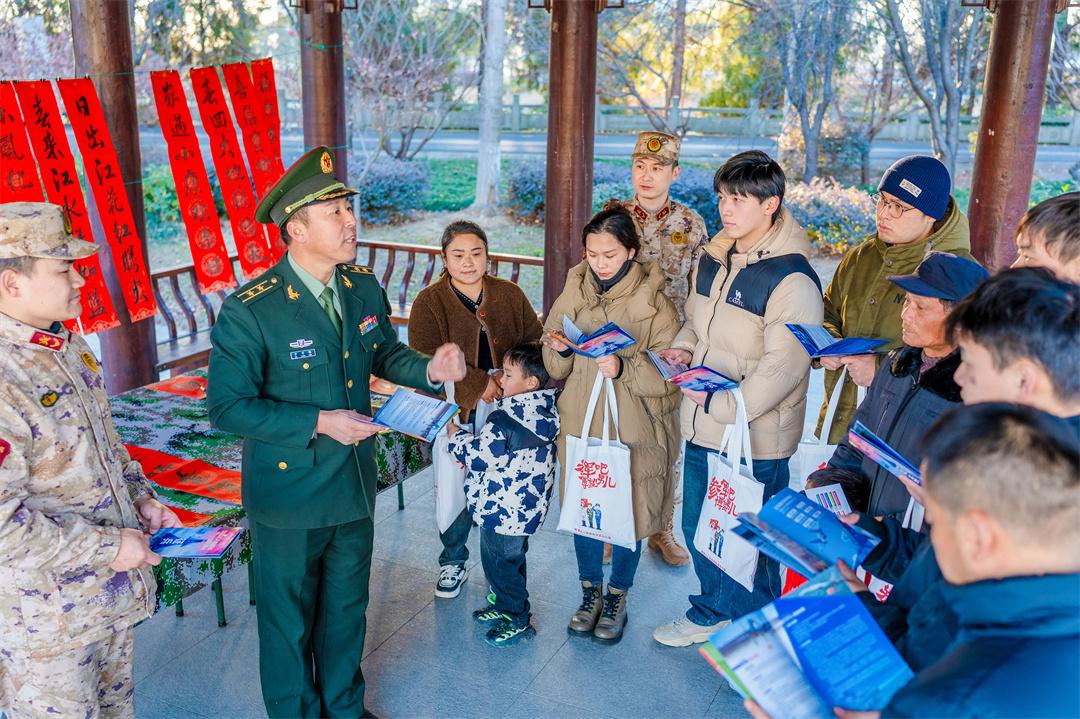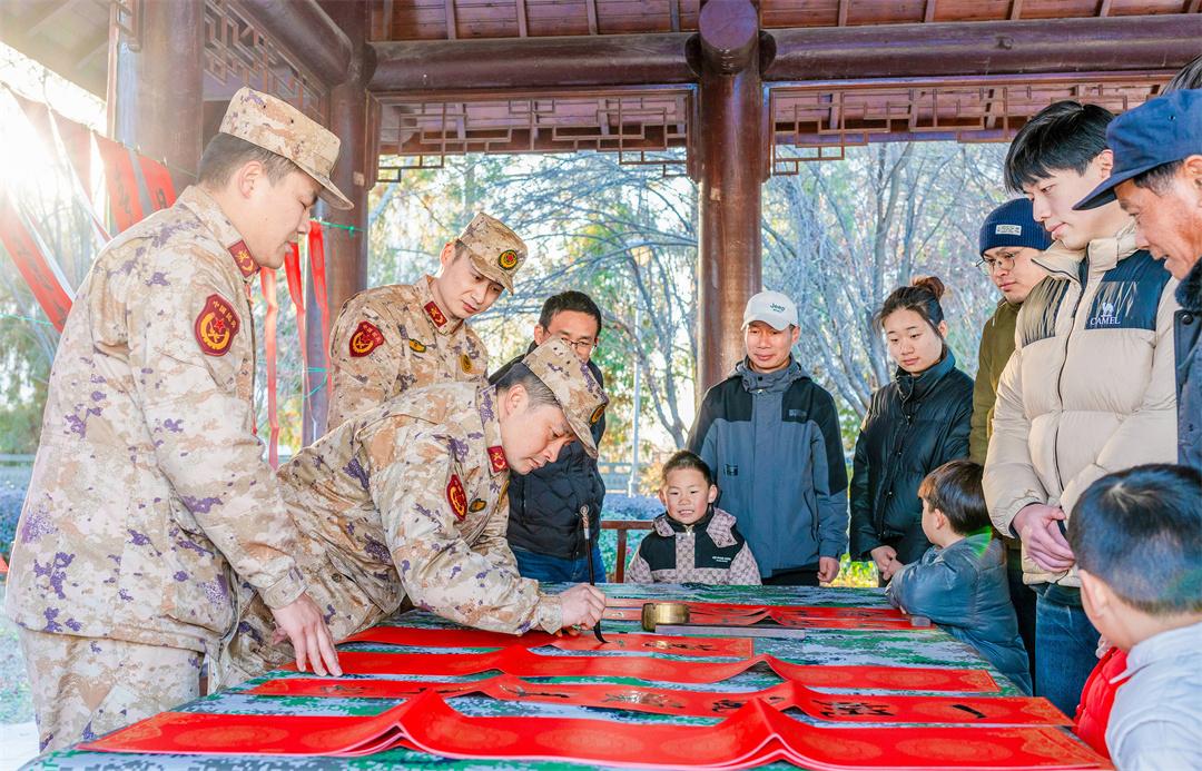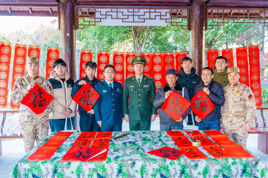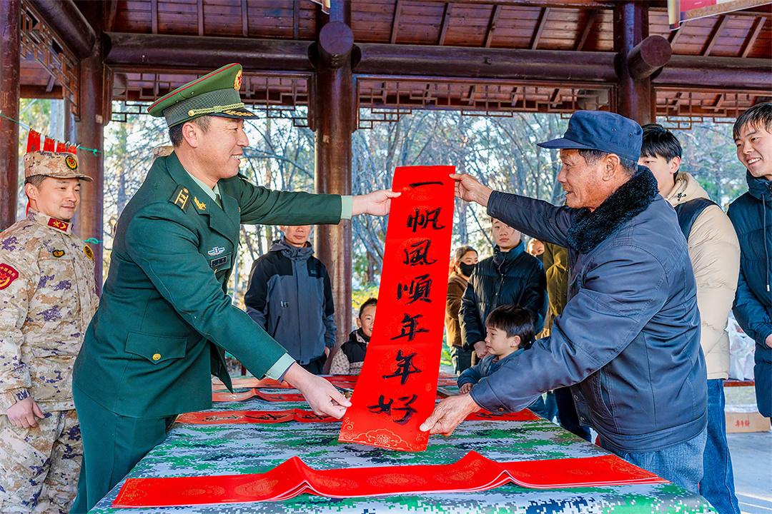 1月15日,安徽省马鞍山市博望区人武部组织现役官兵、文职人员、基干民兵走进村镇文化中心广场,开展“写春联·送祝福·迎新春”慰问专项活动。图为官兵给驻地群众送上新春祝福。