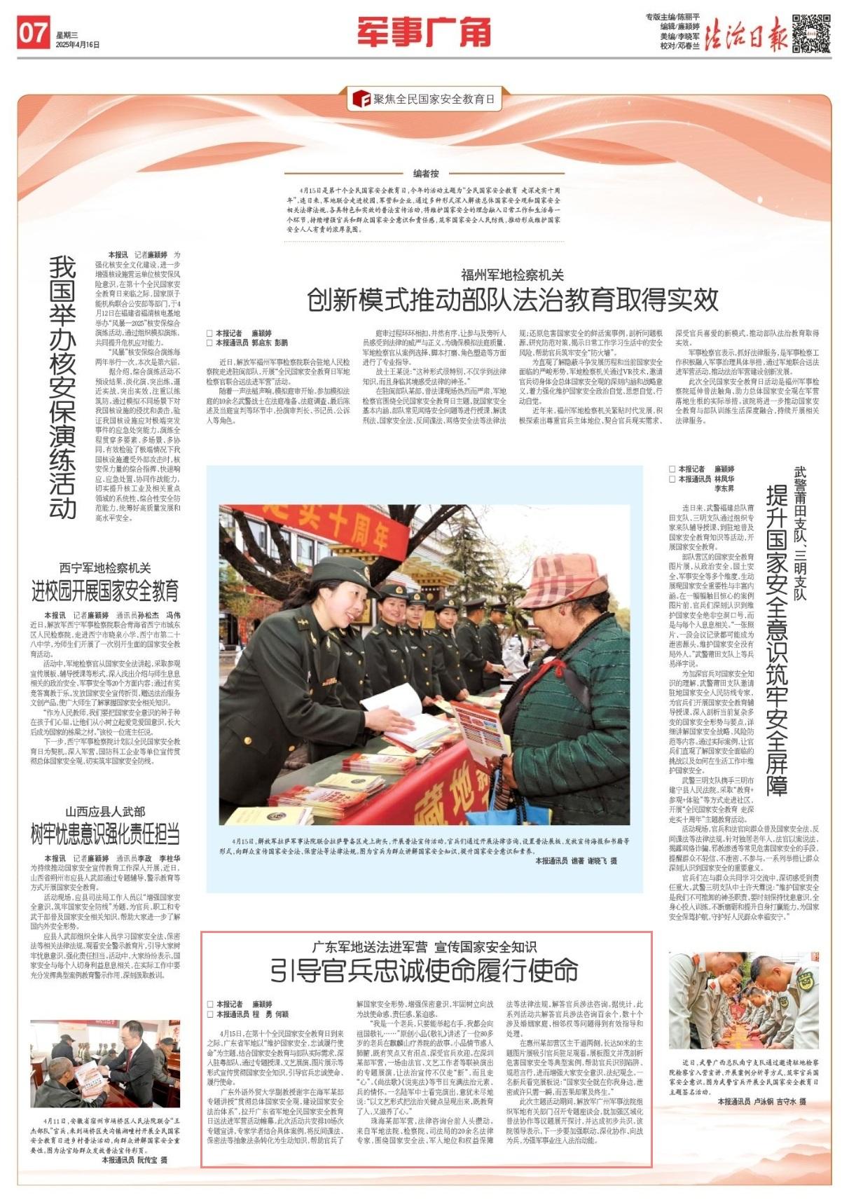 4月15日,在第十个全民国家安全教育日到来之际,广东省军地以“维护国家安全,忠诚履行使命”为主题,结合国家安全教育与部队实际需求,深入驻粤部队,通过专题授课、文艺展演、图片展示等形式宣传贯彻国家安全知识,引导官兵忠诚使命、履行使命。