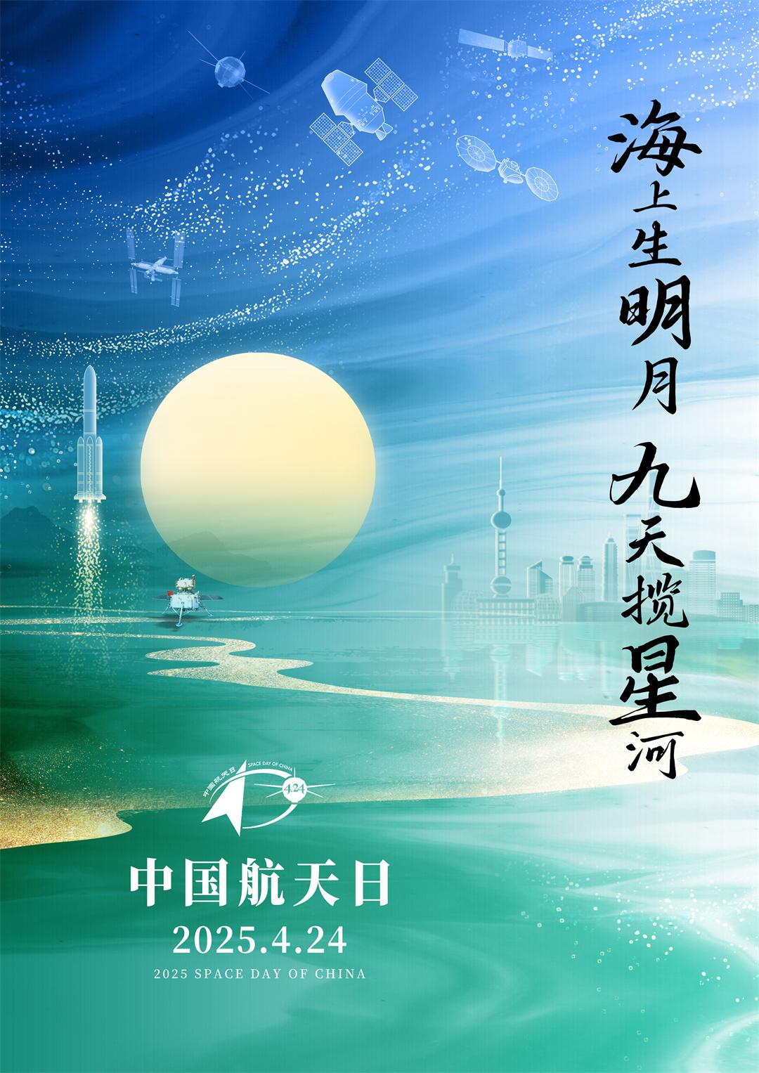 发布会发布了2025年“中国航天日”预告片及宣传海报,突出东方美学,以象征生机与活力的青绿色系融合水墨背景而成,明月近旁是“嫦娥六号”探测器身影,展示中国探月工程丰硕成果,圆月与发射升空的长征火箭组成数字“10”,寓意今年是第十个“中国航天日”,海报由安徽省设计师方喜节设计。除了传统海报,今年“中国航天日”还有通义万相视觉生成大模型生成的人工智能动态海报,与其他优秀海报作品一并发布。